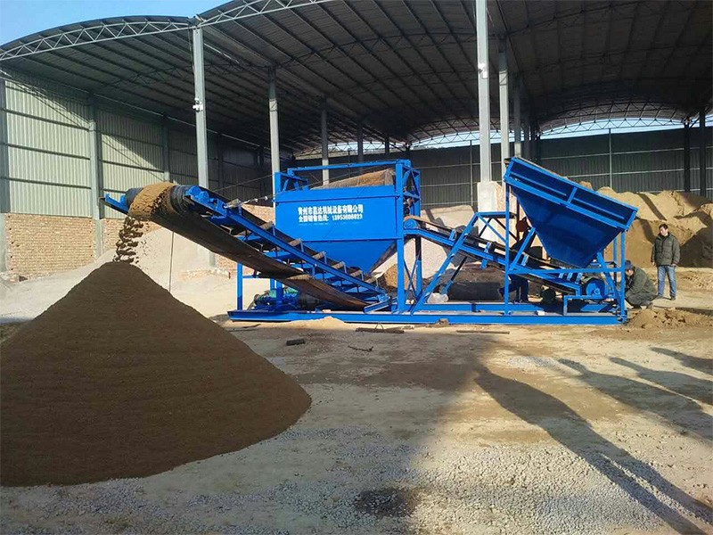 整個設備由原料儲料斗、原料供料皮帶機、平置篩網、成品砂堆料皮帶、棄石出料槽等組成,設備通電運轉后由裝載機將原料裝入大容量儲料斗,原料經由供料皮帶投入到平置篩筒,旋轉的篩筒帶動原料在筒內葉片的推擠、翻滾下形成原料在篩網面滑滾的人工篩砂效果,篩出的成品砂通過集料斗落在成品砂皮帶上,同時被皮帶提升落下呈成品料堆、或直接落入儲料斗,整個過程連續且物料分級清楚。